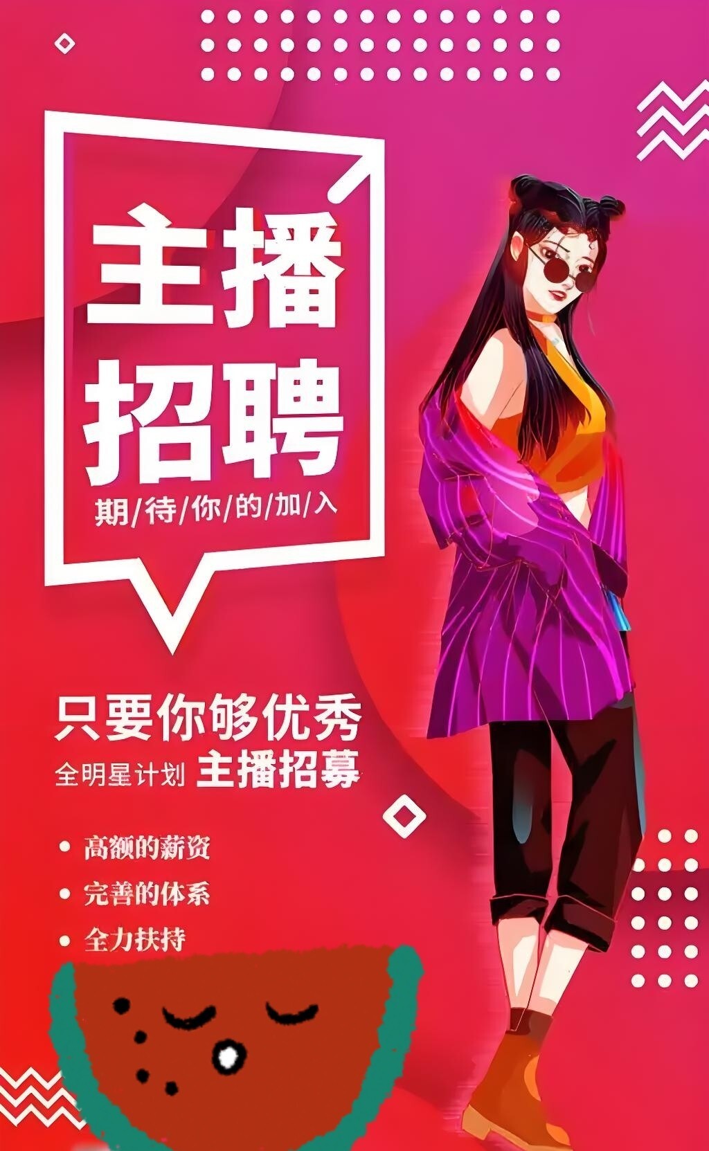 我们正在寻找热爱直播、充满活力、具备独特个人魅力的你,加入我们的娱乐主播团队!工作时间灵活!前期公司资金规划扶持,保底工资加提成,公司孵化成熟后可居家直播!